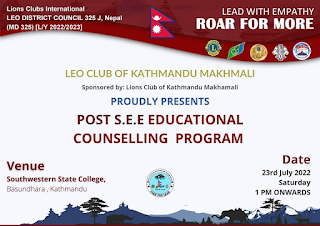 काठमाडौं । लायन्स क्लब अन्तर्राष्ट्रियको संयोजनमा रहेको लियो जिल्ला परिषद ३२५ जे नेपाल अन्तर्गतको लियो क्लब काठमान्डौं मखमलीले एसइइ दिएर बसेका बिद्यार्थीहरुको लागि लक्षित गर्दै यसै साउन ७ गते साउथवेस्टर्न स्टेट कलेज , वसुन्धरा काठमाडौँमा दिउँसो १ देखि ४ बजे सम्म एसइइ पछिको शैक्षिक परामर्श कार्यक्रम संचालन गर्ने भएको छ ।