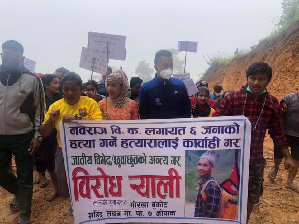 २३ जेठ, गोरखा। रुकुमको चौरजहारी घटनाका दोषीलाई कारबाहीको माग राख्दै गोरखाको बुन्कोटमा प्रदर्शन भएको छ । उनीहरुले छ जनाको हत्याको बिरोध र उक्त घटनाका दोषीलाई कानुन बमोजिम कारबाहीको माग गरेका छन् ।