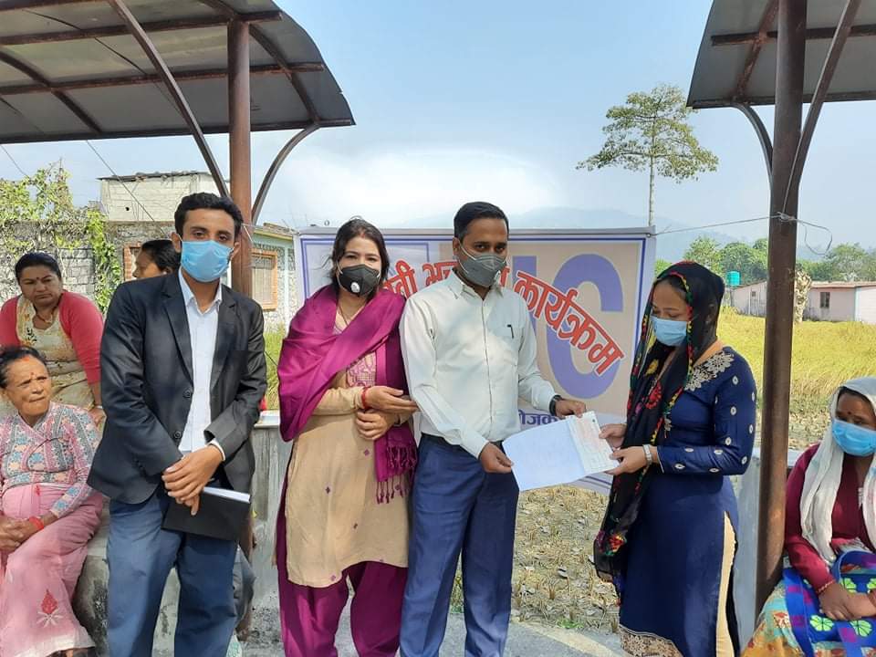 शाखा प्रवन्धक सन्जिव खनाल, एजेन्सि म्यानेजर रन्जना भण्डारी र प्रकाश राईभाट द्वारा विमित परिवारलाई एक कार्यक्रमको विच चेक प्रदान गरिएको थियो।