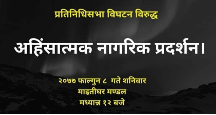 ८ फागुन, काठमाडौं । प्रतिनिधिसभा विघटनविरुद्ध आज फागुन ८ गते शनिबार माइतीघर मण्डलामा डा. गोविन्द केसी सहितको अहिंसात्मक नागरिक प्रदर्शन हुने भएको छ ।