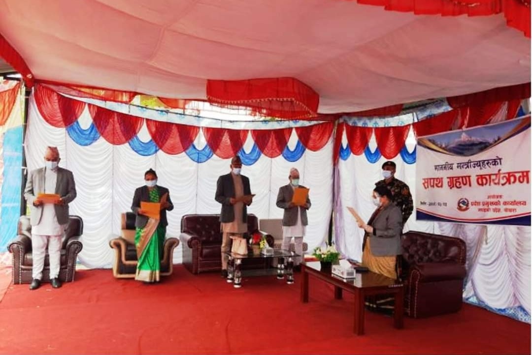 भौतिक पूर्वाधार विकास मन्त्री रहेका रामशरण बस्नेत, सामाजिक विकास मन्त्री रहेकी नरदेवी पुन, पर्यटन, उद्योग, वन तथा वातावरण मन्त्री रहेका विकास लम्साल बिनाविभागीय मन्त्रीका रूपमा प्रदेश प्रमुख सीता पौडेलबाट सपथ लिएका छन्।