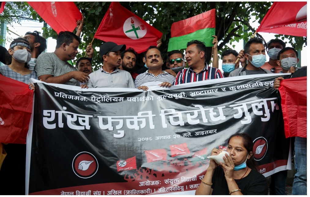 २७ असार, काठमाडौं । विपक्षी गठबन्धनमा आवद्ध दलका विद्यार्थी संगठनले पेट्रोलियम पदार्थमा मूल्यवृद्धि गरेको विरोधमा आइतबार शंख फुकेर विरोध प्रदर्शन गरेका छन् ।