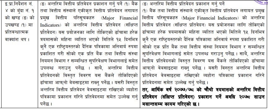 यसअघि त्रैमास सकिएको १५ दिन अर्थात साउन १५ गतेभित्र वित्तीय विवरण प्रकाशन गर्नुपर्ने व्यवस्था रहेको थियो । नेपाल राष्ट्र बैंकले ‘क’, ‘ख’ र ‘ग’ वर्गका इजाजतपत्र प्राप्त संस्थाहरुलाई जारी गरिएको निर्देशन, २०७७ मा संशोधन गरी उक्त व्यवस्था थप गरेको हो ।
