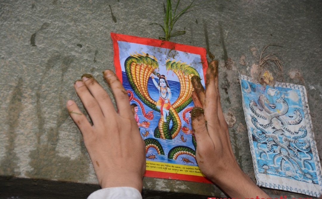 २९ साउन, काठमाडौँ । प्रत्येक वर्ष श्रावण शुक्ल पञ्चमीका दिन मनाइने नागपञ्चमी आज परम्पराअनुसार नागको पूजा अर्चना गरी घरका मूलढोकामा टाँसेर मनाइँदै छ । यसरी नागको तस्वीर टाँस्दा वर्षभर घरमा नाग, सर्प र बिच्छीलगायतका जीवले दुःख नदिनुका साथै अग्नि, मेघ र चट्याङको भयबाट पनि बच्न सकिन्छ भन्ने धार्मिक विश्वास छ ।