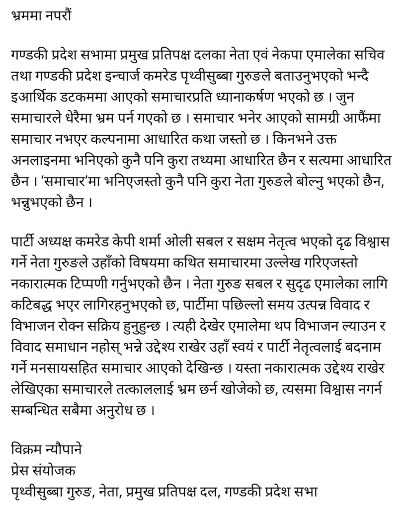 गुरुङको सचिवालयले शुक्रवार विज्ञप्ति जारी गर्दै नामै नसुनिएका मिडियामा गुरुङले बोलेको भनी आएका प्रोपागाण्डाको भ्रममा नपर्न आग्रह गरेको छ । प्रेस संयोजक विक्रम न्यौपानेले जारी गरेको विज्ञप्तिमा एमाले नेतृत्व र पिएस गुरुङलाई बदनाम गर्ने मनसायले यस्ता प्रचार भइरहेको उल्लेख छ ।