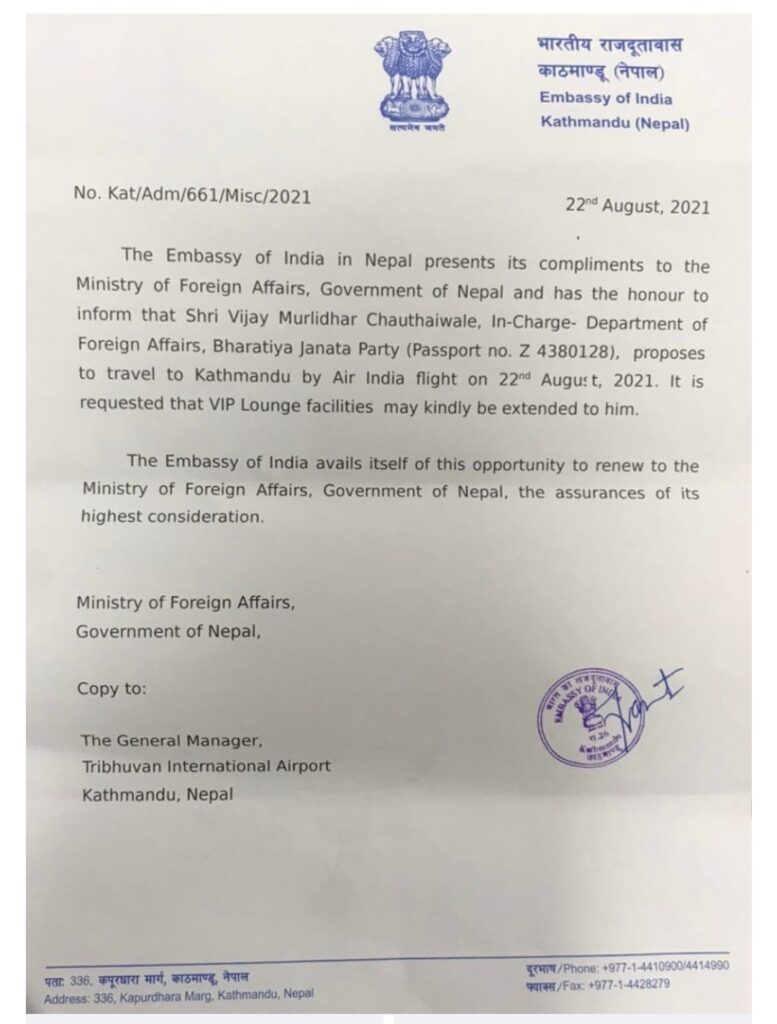 यात्राको उध्देश्य र भेटघाटका पात्रहरु नखुलाई भारतीय दूतावासले त्रिभुवन अन्तर्राष्ट्रिय विमानस्थलको बिशिष्ट कक्ष खोल्न परराष्ट्र मन्त्रालयलाई आजै बिहान पत्र लेखेको थियो ।
