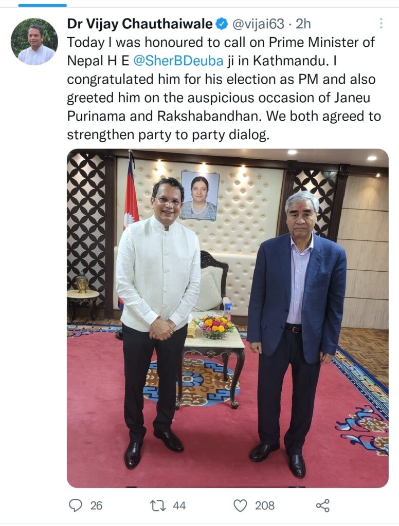 ६ भाद्र, काठमाडौं । सत्तारुढ भारतीय जनता पार्टी बिजेपीका बिदेश बिभाग प्रमुख बिजय मुरलीधर चौथाइवालेको आकस्मिक नेपाल भ्रमणमा आएका छन् । काठमाडौं आएसंगै प्रधानमन्त्री शेर वहादुर देउवासंग भेटघाट गरेर जनैपुर्णिमा को शुभकामना आदानप्रदान भएको मुरलिधरले ट्विटर मार्फत जानकारी गराएका छन् ।